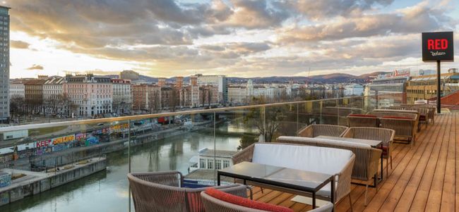 Donaukanal-Coolness auf 30 Metern. Die neue Rooftop Bar "Istros“ im neuen Wiener Radisson Red Hotel.