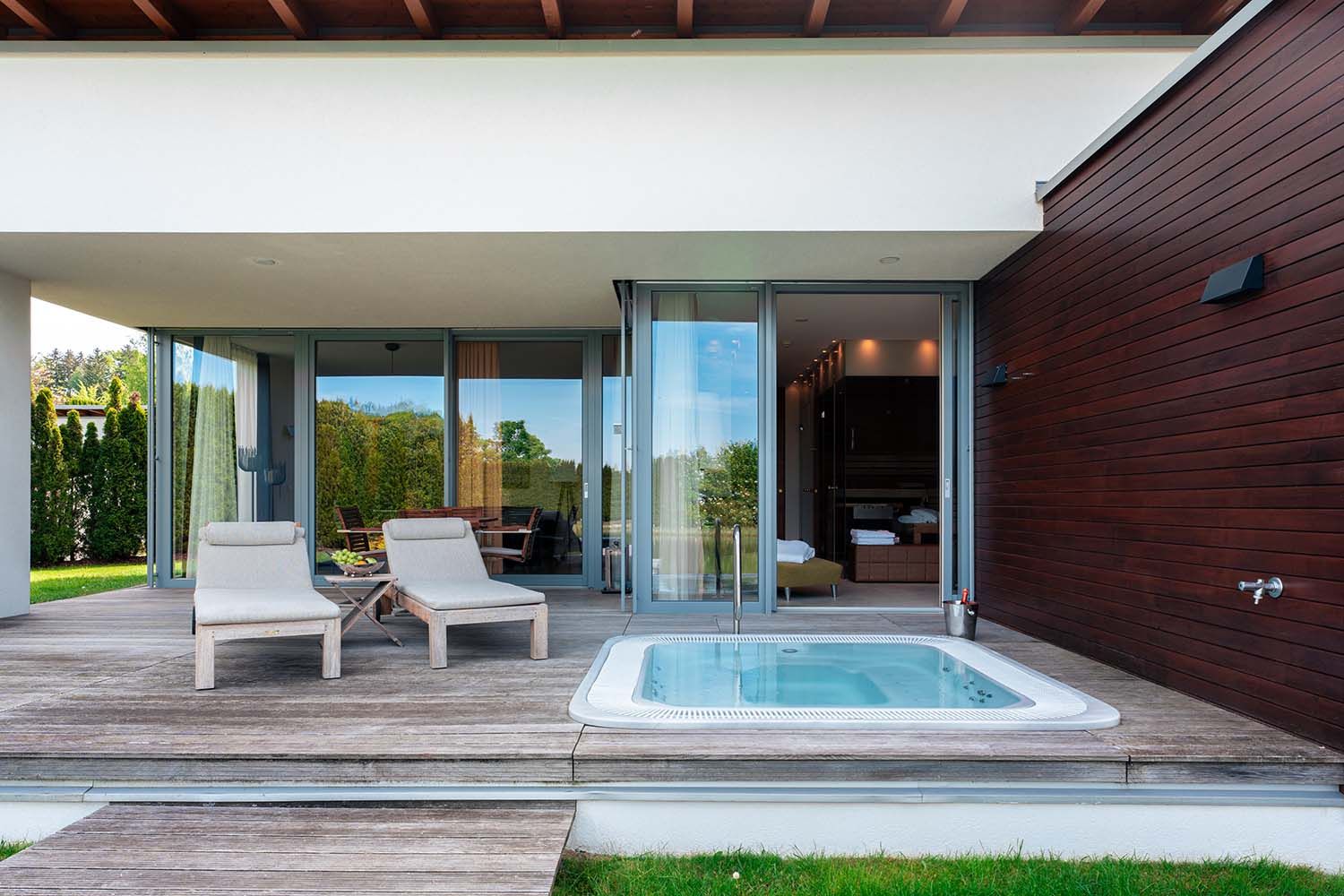 In den Geinberg5 Villen genießen Paare ungestörte Auszeit auf höchstem Niveau – in einer der 21 bis zu 300 Quadratmeter großen, eleganten Villen. Jede Villa verfügt über einen Private Spa mit Sauna, Thermalwasser-Druckmassage-Becken auf der Terrasse – und sogar eigenem Butler-Service. Die Anlage liegt an zwei Naturbadeteichen, die von privaten Stegen zugänglich sind. Hinzu kommen der Zugang zum SPAplus, dem neuen Adults Only Bereich mit großzügigen Pools, Hamam, Schaum-Dampfbad, Salz-Lounge und Dachgarten mit Event-Sauna sowie einem 450 Quadratmeter großen Fitnesscenter. Kulinarik auf höchstem Niveau heißt: À-la-carte-Genuss direkt in der Villa, für absolute Zweisamkeit.